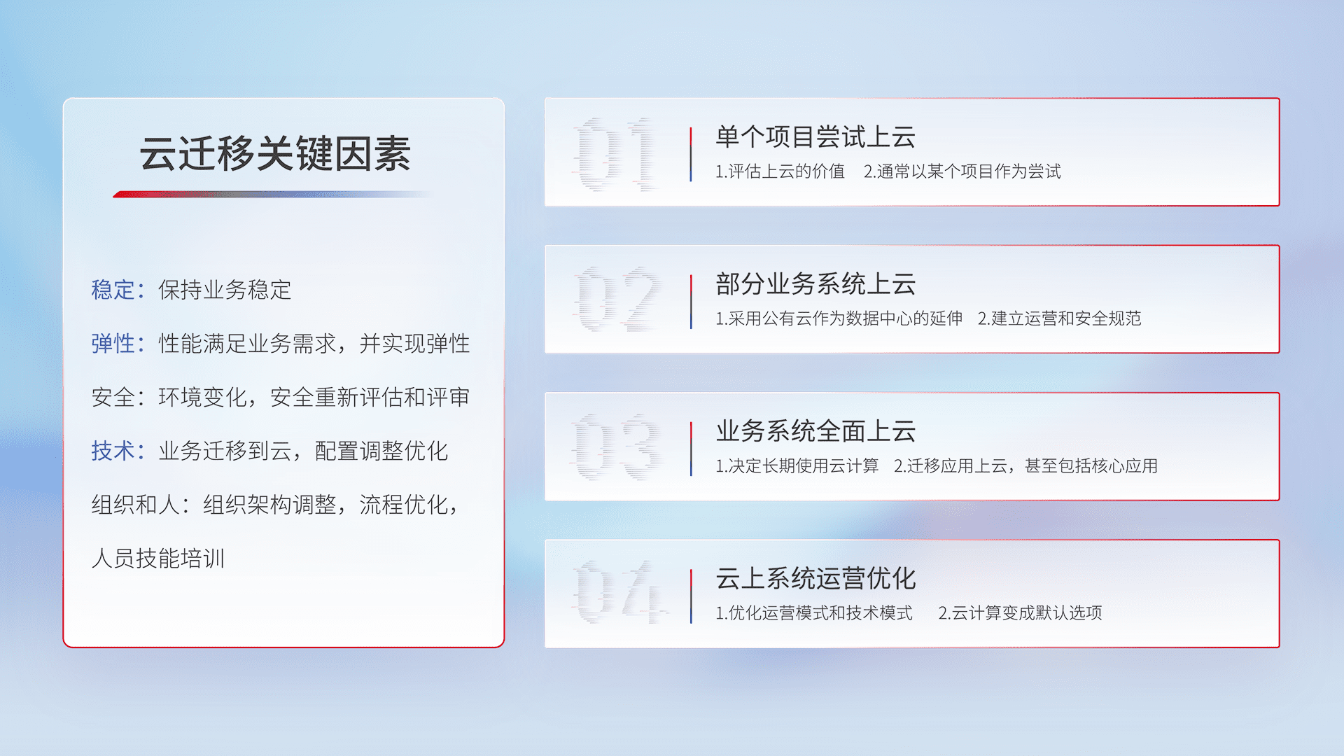 结合实际业务,,从规划设计、、、、云平台选型、、、云原生改造、、、数据迁移、、集成交付,,,迁移全过程为客户识别最佳上云路径,,做好风险识别管理,,,,设计网络架构、、、身份权限、、安全审计合规、、、、操作审计、、日志审计、、、、监控告警策略、、、、多站点容灾设计等,,对云上基础设施进行整体规划,,,提升IT治理水平,,以满足弹性、、、、高可用、、高性能的需求。。。