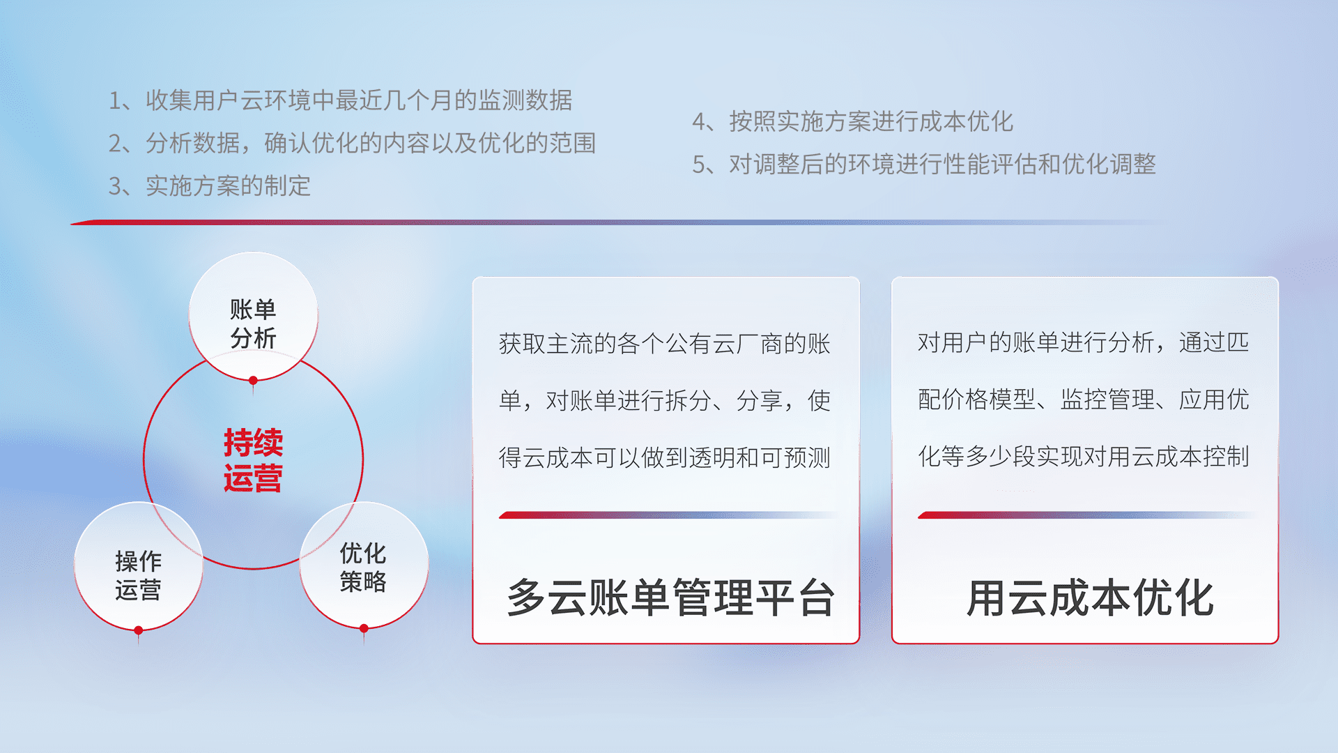 通过多云纳管,,以统一的资源数据模型把客户的云资源进行抽象和封装,,,进而实现对多云资源的统一操作,,保障云资源管理的可靠性、、、、稳定性与可用性。。量身定制化运维内容,,,,配置、、、、开发运维、、、、补丁管理、、、备份、、、、监控、、、、认证和访问管理、、审计和日常巡检等,,保障在用云过程中的可靠度,,,,稳定度以及高可用率。。。。